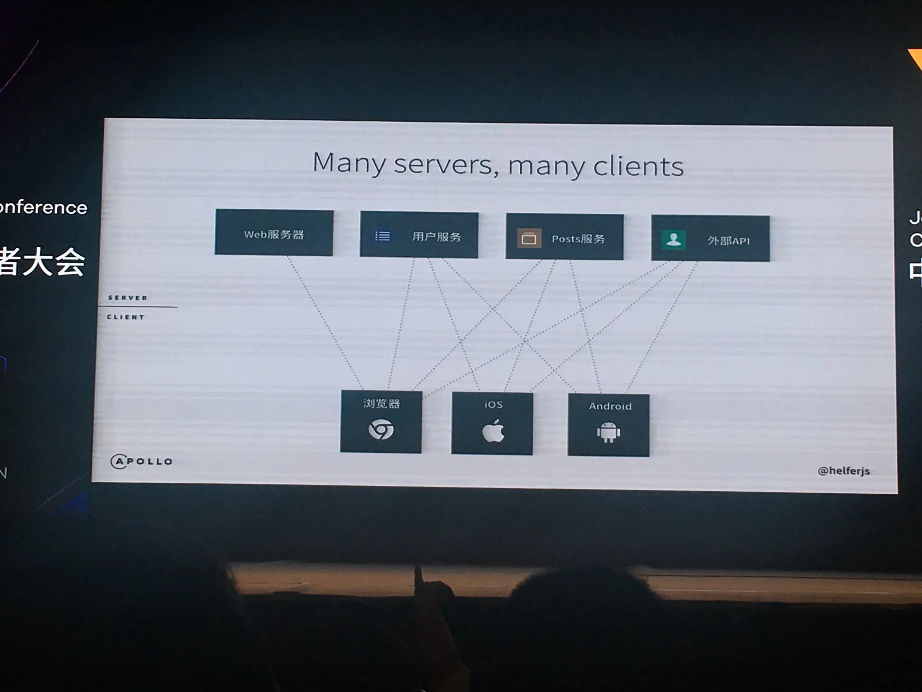 Web 服务器返回代码,用户服务、Posts服务、外部 API 返回数据给浏览器。页面会有很多请求,请求各种数据。现在又多了多个终端,浏览器,iOS,Android。