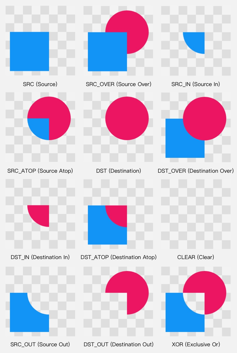 PorterDuff.Mode的人,看到这里很可能依然会一头雾水:「什么怎么结合?就……两个图像一叠加,结合呗?还能怎么结合?」你还别说,还真的是有很多种策略来结合。最符合直觉的结合策略,就是我在上面这个例子中使用的