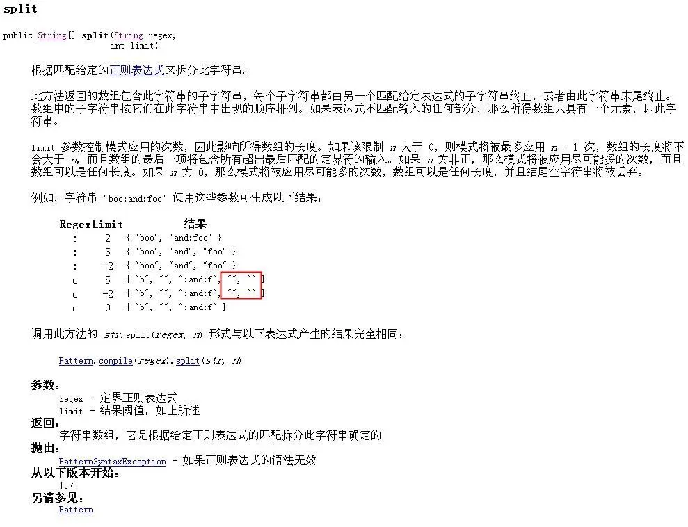 看了下jdk里String类的public String[] split(String regex,int limit)方法,感觉平时不太会用这方法,以为在用正则表达式来拆分时候,如果匹配到的字符是最后一个字符时,会拆分出两个空字符串,