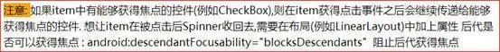注意: Spinner:如果item中有能够获得焦点的控件(例如CheckBox),则在item获得点击事件之后会继续传递给能够获得焦点的控件.