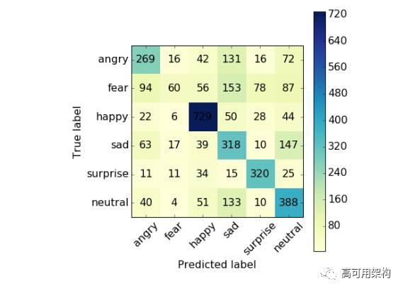 仔细看下每个表情的预测结果。图 9 是测试集的模型预测的混淆矩阵。矩阵给出表情预测的数量和多分类模型的效果展示:
