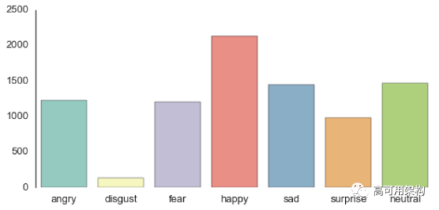 当作者分析语料数据集时,发现“disgust”分类相对于其它分类不均衡(只有113 张样本)。作者将两类相似的情感(disgust 和 anger)合并起来。为了防止数据倾斜,作者构建一个数据生成器 fer2013datagen.py [1],该生成器很容易分割训练集和保留数据集。本例使用 28709 张面部图片作为训练集,余下的图片作为测试集和验证集(每个数据集 3589 张)。这样我们获得了 6 类均衡的数据集,见图2,包含 happy, sad, surprise, fear, anger, and neutral。