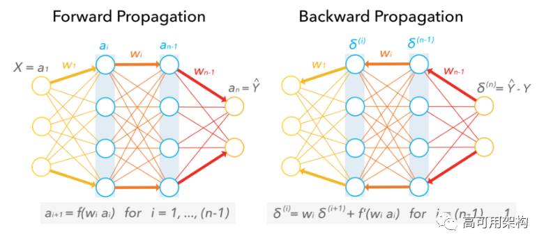 图 6. Neural network during training: Forward propagation (left) to Backward propagation (right).