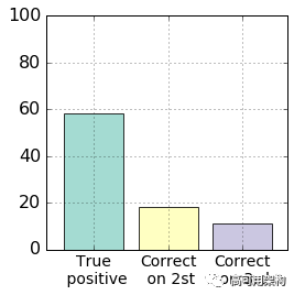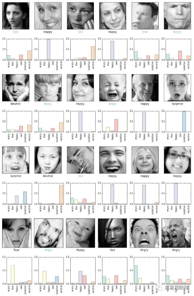 最后的 CNN 模型交叉验证准确度是 58%,其具有积极意义。因为人类面部表情经常由多个基本表情组合,仅仅用单一表情是很难描述。本例中,当训练模型预测不准确时,正确的标签一般是第二相似的表情,见图 8(浅蓝色标签)。