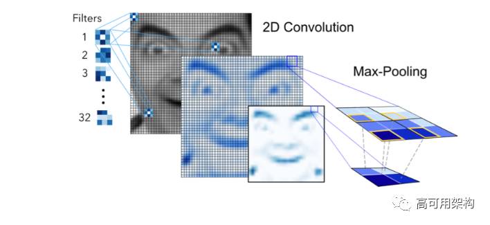 numpy 数组传入 Convolution2D 层,指定过滤层的数量作为超参数。过滤层(比如,核函数)是随机生成权重。每个过滤层,(3,3)的感受野,采用权值共享与原图像卷积生成 feature map。