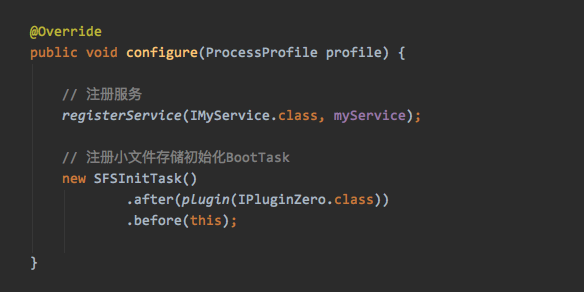 configure()阶段,该阶段是根据之前的依赖树遍历执行。通常用于初始化一些数据配置、注册IService服务、向前面依赖的模块注册一些回调等等。