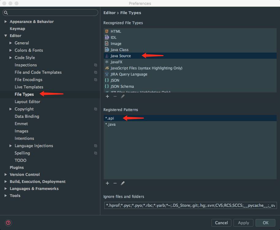 还有个细节,如果想编辑.api后缀的java文件,为了能让Android Studio继续高亮该怎么办?可以在File Type中把.api作为java文件类型。