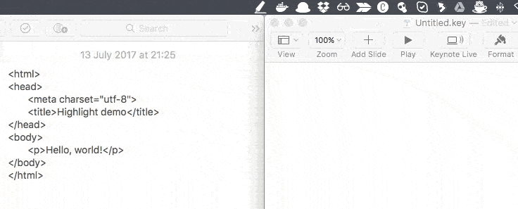 Highlight is a rich-featured syntax highlighter for Keynote slides that allows you to get syntax-highlighted code in RTF with one click. Its main feature is based on highlight.js, which means 176 langauges and 79 styles are available. Check out the demo to see what you get with the application.