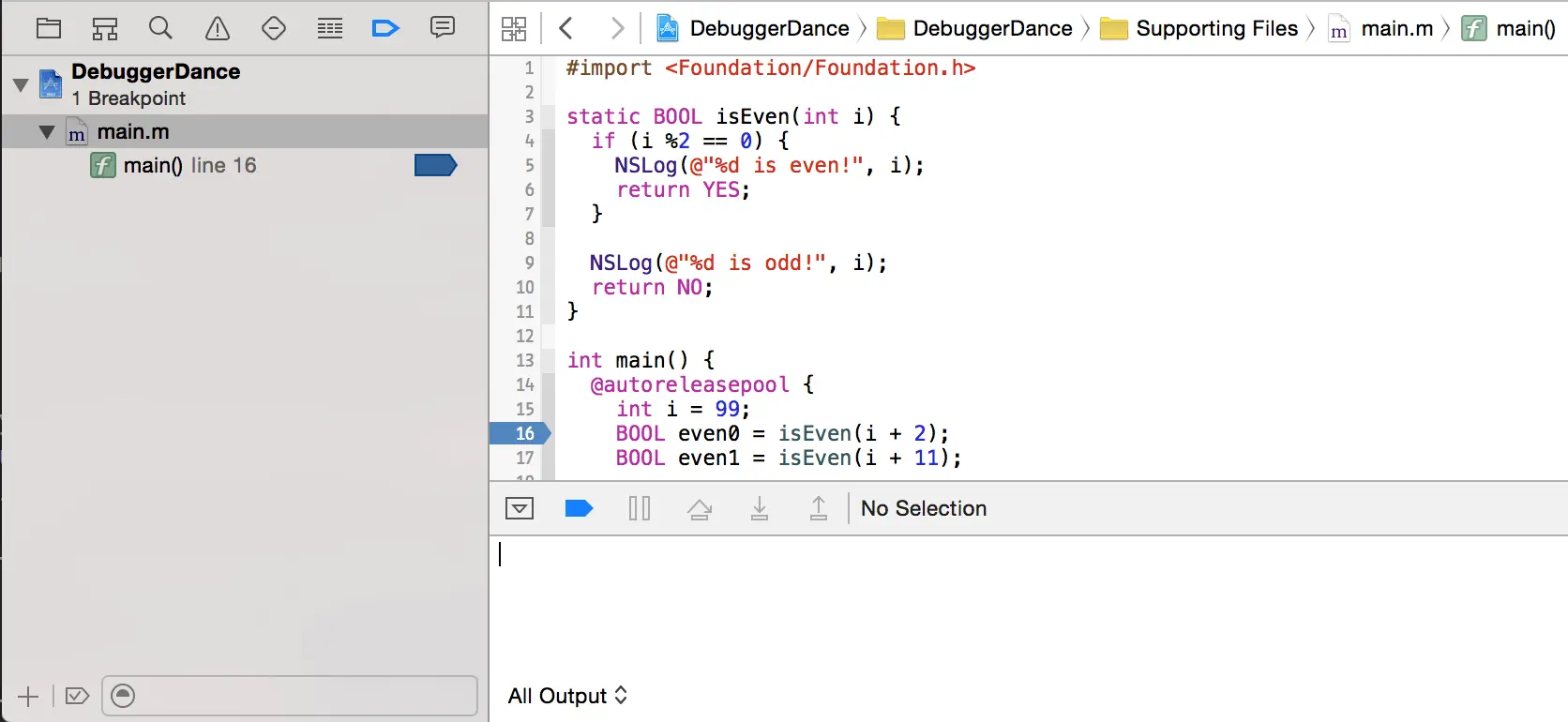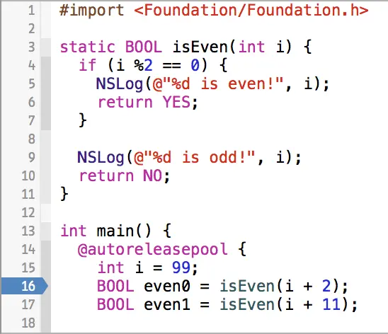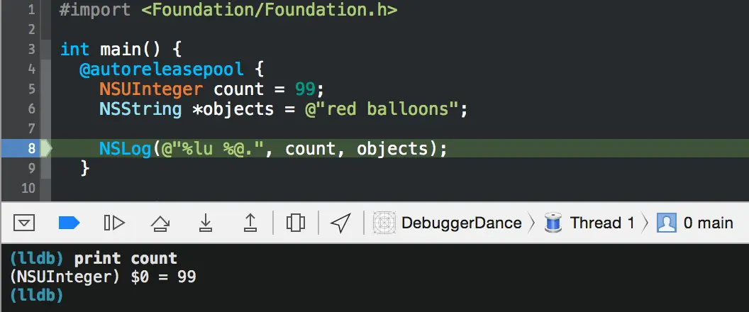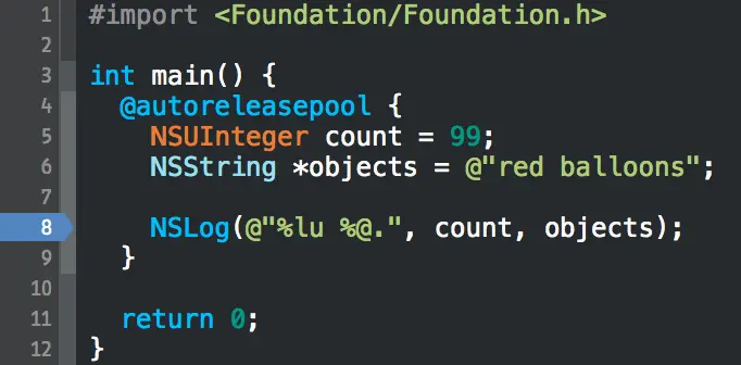 这里有一个简单的小程序,它会打印一个字符串。注意断点已经被加在第 8 行。断点可以通过点击 Xcode 的源码窗口的侧边槽进行创建。