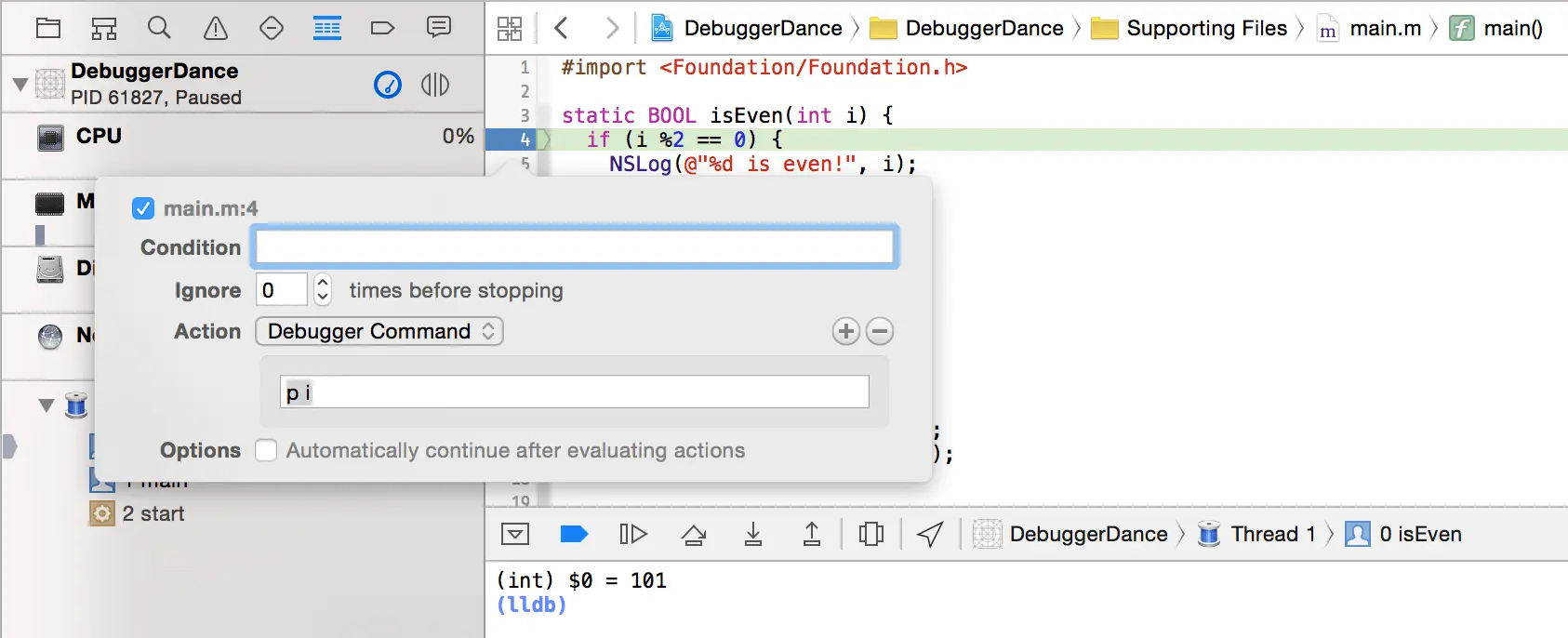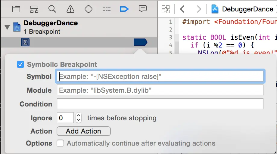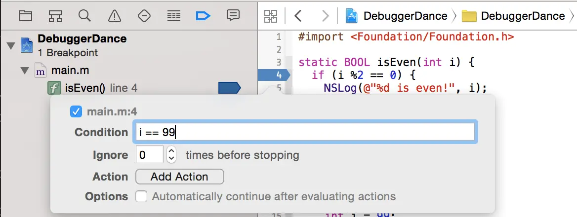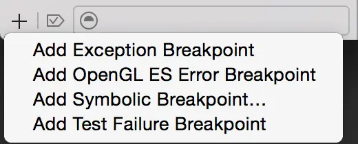 当你通过 Xcode 的源码编辑器的侧边槽 (或者通过下面的方法) 插入一个断点,程序到达断点时会就会停止运行。