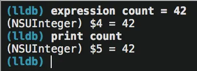 现在你已经可以打印对象和简单类型,并且知道如何使用 expression 命令在调试器中修改它们了。现在让我们使用一些变量来减少输入量。就像你可以在 C 语言中用 int a = 0 来声明一个变量一样,你也可以在 LLDB 中做同样的事情。不过为了能使用声明的变量,变量必须以美元符开头。