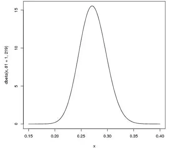 然而,随着整个赛季运动员逐渐进行比赛,这个曲线也会逐渐移动以匹配最新的数据。由于我们拥有了更多的数据,因此曲线(击球率范围)会逐渐变窄。假设赛季过半时,运动员一共打了300次,其中击中100次。那么新的贝塔分布是Beta(81+100,219+200),如下图:
