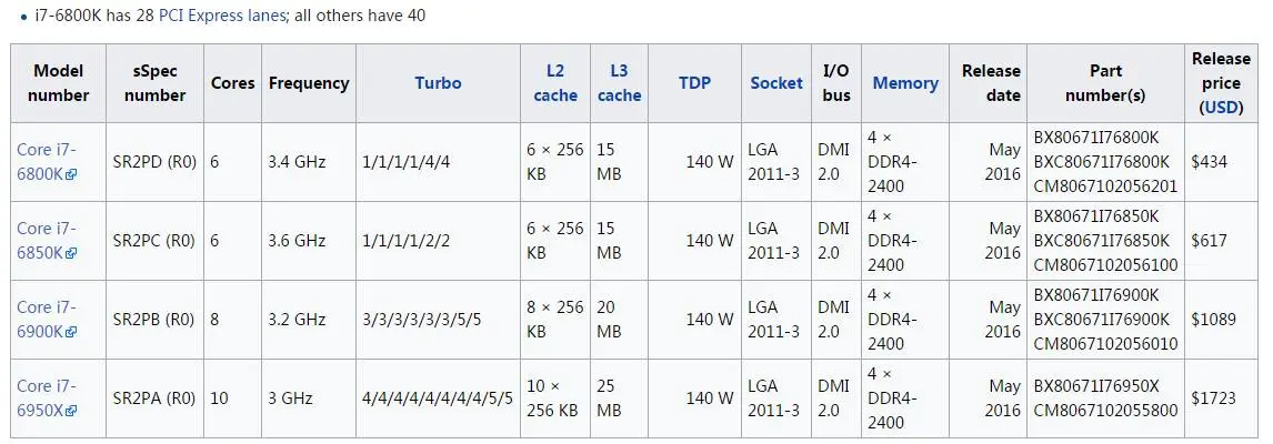 CPU对于深度学习的任务来说,重要性并没有GPU那么高,所以一般个人用户就选择i5或e5-1620v4这类性价比较高的处理器。但为了不让CPU成为性能提升的瓶颈,我把目光放在了i7和e5身上,选择CPU个人认为需要考虑的是:核心架构、核心数线程数、主频和PCIE通道数(lanes)。 主板限定了CPU必须为2011-v3或酷睿I7系列的处理器,其它就不必考虑了。重点提PCIE通道数,在深度学习的任务处理中,PCIE通道数lanes越高,数据处理得越快,可以理解为一个40车道的高速公路肯定比16车道的快!所以我们优先考虑Lanes为40的CPU,那么可以缩小范围到以下几款:(数据引用自维基百科)