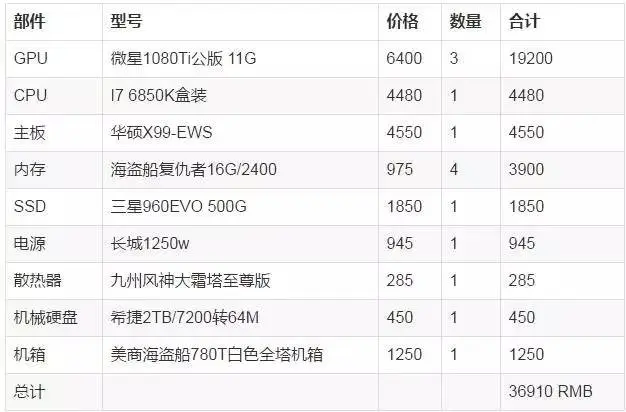 PS: 最近由于比特币价格上涨,矿工不断搜刮市面上的显卡,导致显卡价格不断攀升,在上月给供应商发配置单时,公版1080Ti最低价只要RMB 5800,但过了几周实际下单时,价格已经上涨到RMB 7000,而且不一定有货,所以在购买GPU之前要问清你的供货商有没有货。