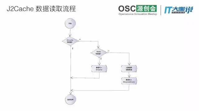 每次读数据的时候首先从Ehcache里先读,因为Ehcache在你的内存中。如果有的话直接返回,没有的话就通过通过网络去读redis的数据,如果数据有的话就把它塞到Ehcache里面,再返回。如果redis也没有,这时才读数据库的数据,然后同时把它的数据塞到Ehcache和redis里面,最后返回数据。