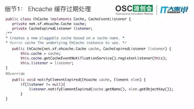 开源中国是用Java开发的。Java在做缓存的时候有一个很著名的Ehcache框架,它是基于内存的一个缓存框架,速度非常快。因为不能把所有数据都放在内存里,它可以把一部分数据放进磁盘,是一个两级的缓存。它还支持多个区域的缓存结构,用户是一个缓存,新闻帖子之类的可以单独设置缓存失效策略。Ehcache还提供了缓存数据的侦听接口。一个缓存数据一旦出现问题,就会得到通知。Ehcache也支持集群部署。
