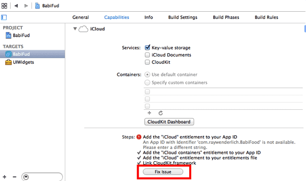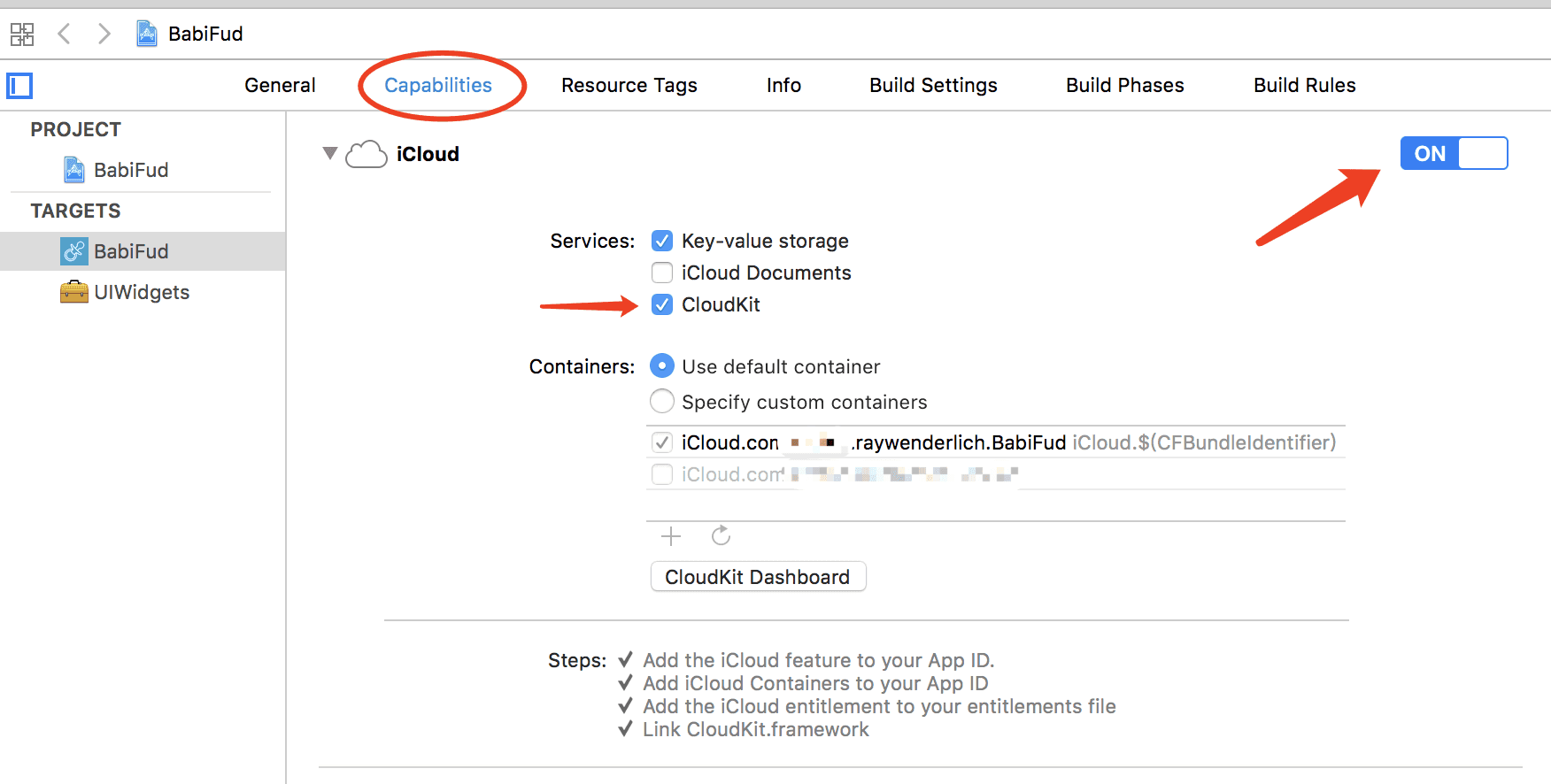 Container ID和Bundle ID冲突。如,Bundle ID为com.<your domain> .BabiFud,则iCloud里的Container ID为iCloud.com.<your domain> .BabiFud。这个工作Xcode会自动帮你完成,务须担心! - 由于CloudKit要访问数据的全局标识符,所以