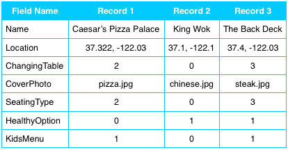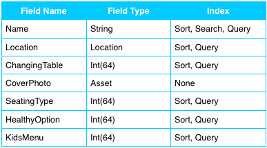 对于每个记录,数据和App里表示可能完全是不同的,例如,SeatingType和ChangingTable是structs。因此,座椅类型的Int值可能对应于“高脚椅”或“助推器”座椅。对于HealthyOption和KidsMenu,Int值表示布尔类型:0表示建立不具有该选项,1表示它是。