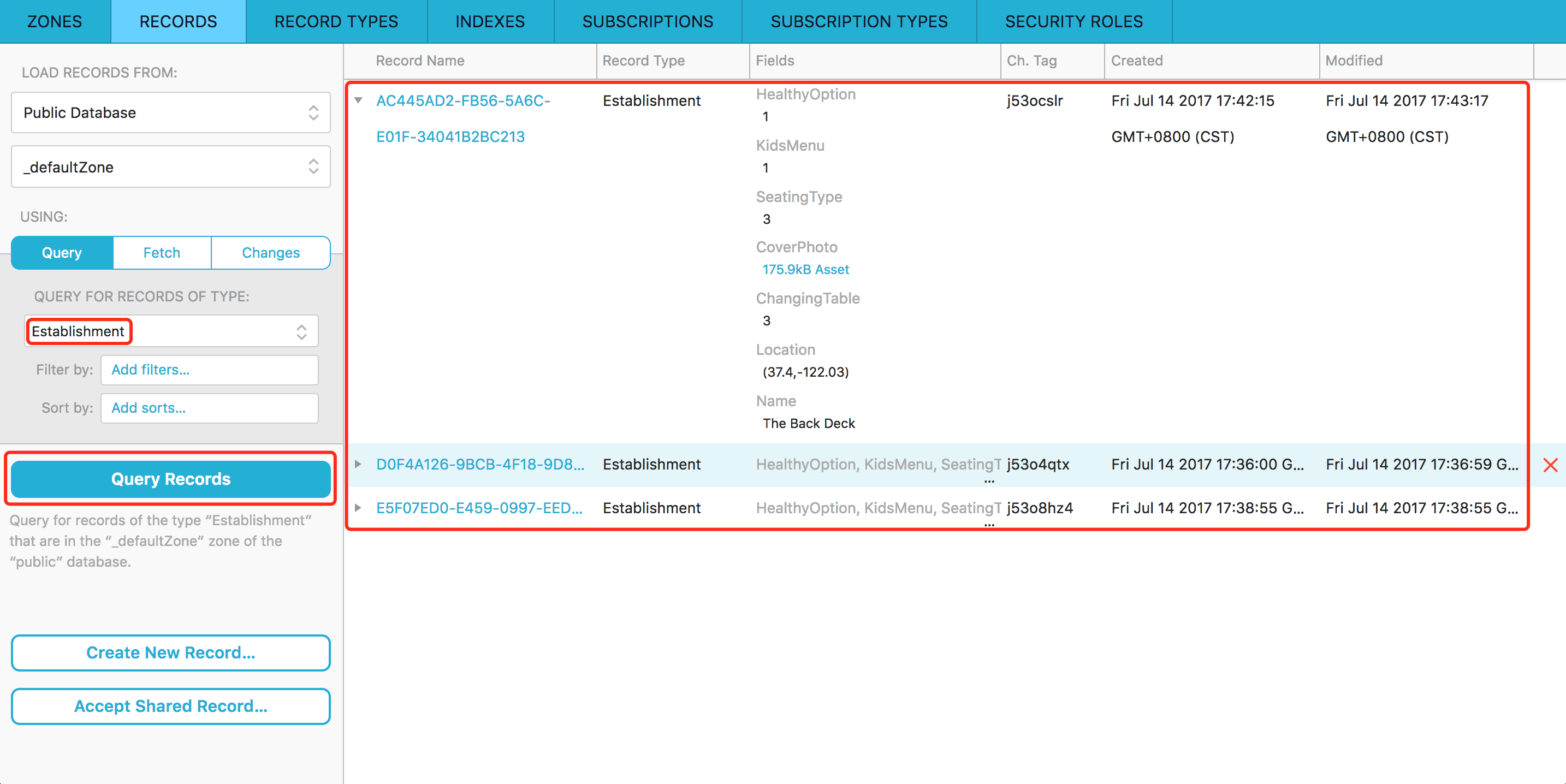 模型类通过调用CloudKit来支撑视图。records作为CloudKit对象。Establishment是在模型中的主要record类型,它代表Demo中的各种餐馆。