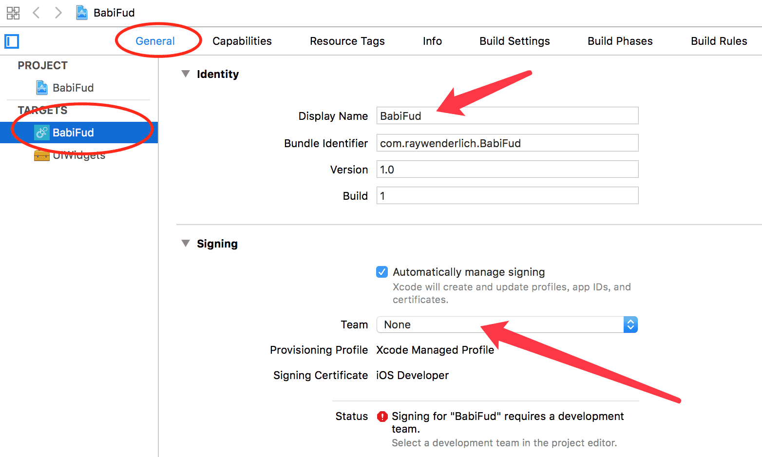 打开BabiFud.xcodeproj,并在Project Navigator选择BabiFud工程,接着选择BabiFud target,在General选项里替换好Bundle Identifier,最后选着好有付费开发者计划的Team即可。