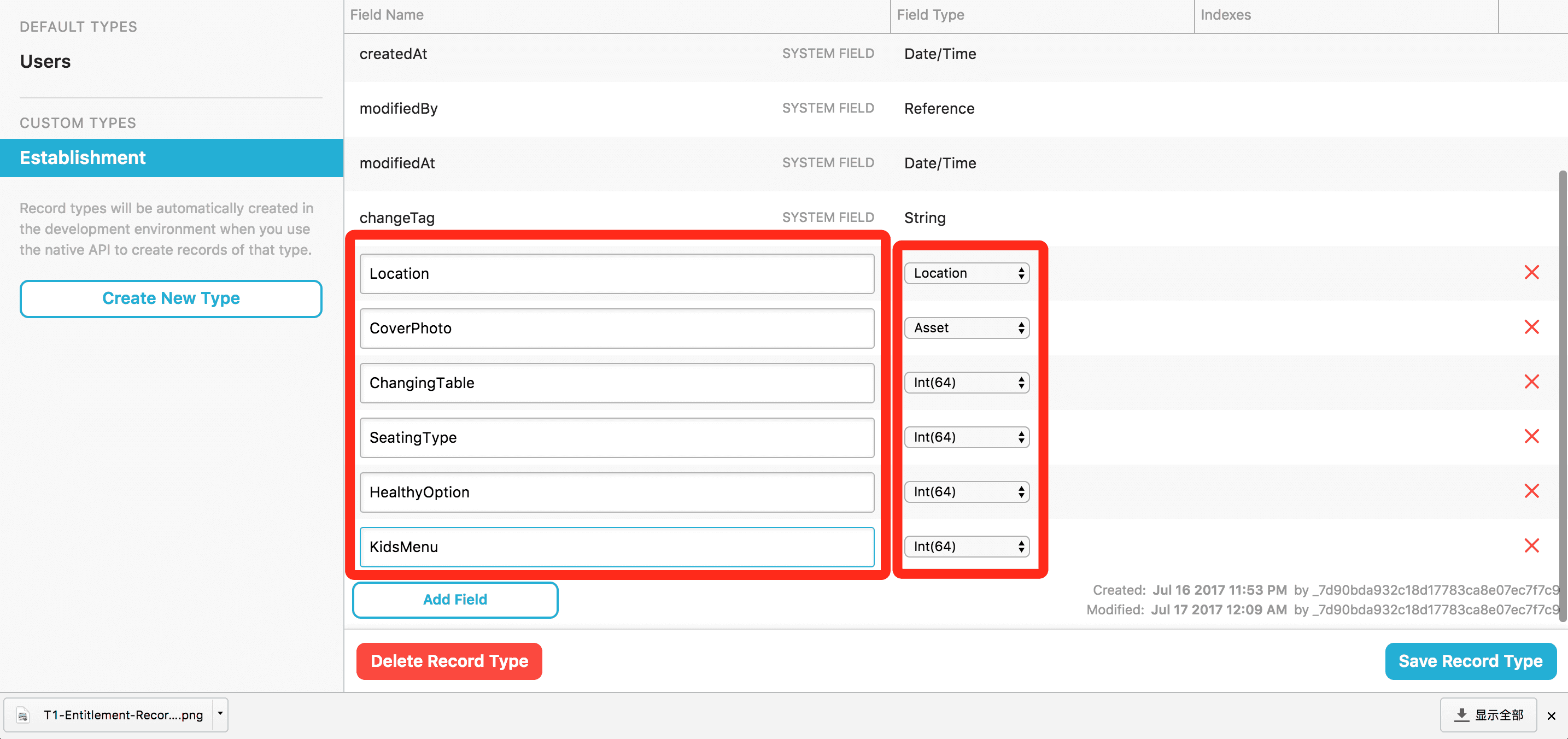 在这里,搭配我们的Demo需要创建一个名为Establishment的Record Type数据模型,企业模型需要很多数据构成:名称,位置和可用性,以及各种适合儿童的选项。除了内置字段以外,我们的自定义字段包含:
