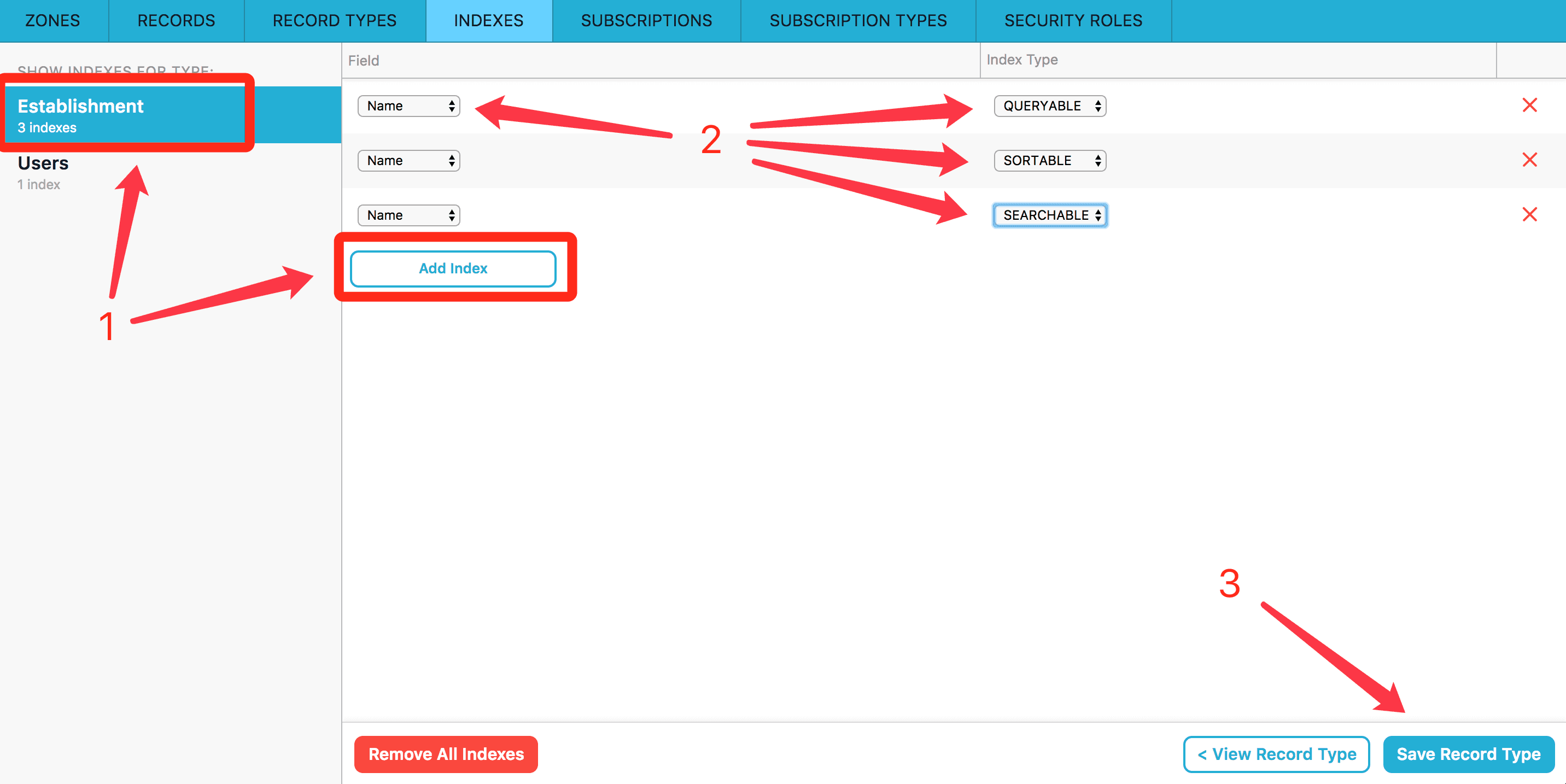 然后新建索引,切换到INDEXS栏,选中刚刚新建的记录类型Establishment,点击Add Index为Name字段添加三个索引,分别是:QUERYABLE,SOTREABLE,SEARCHABLE。