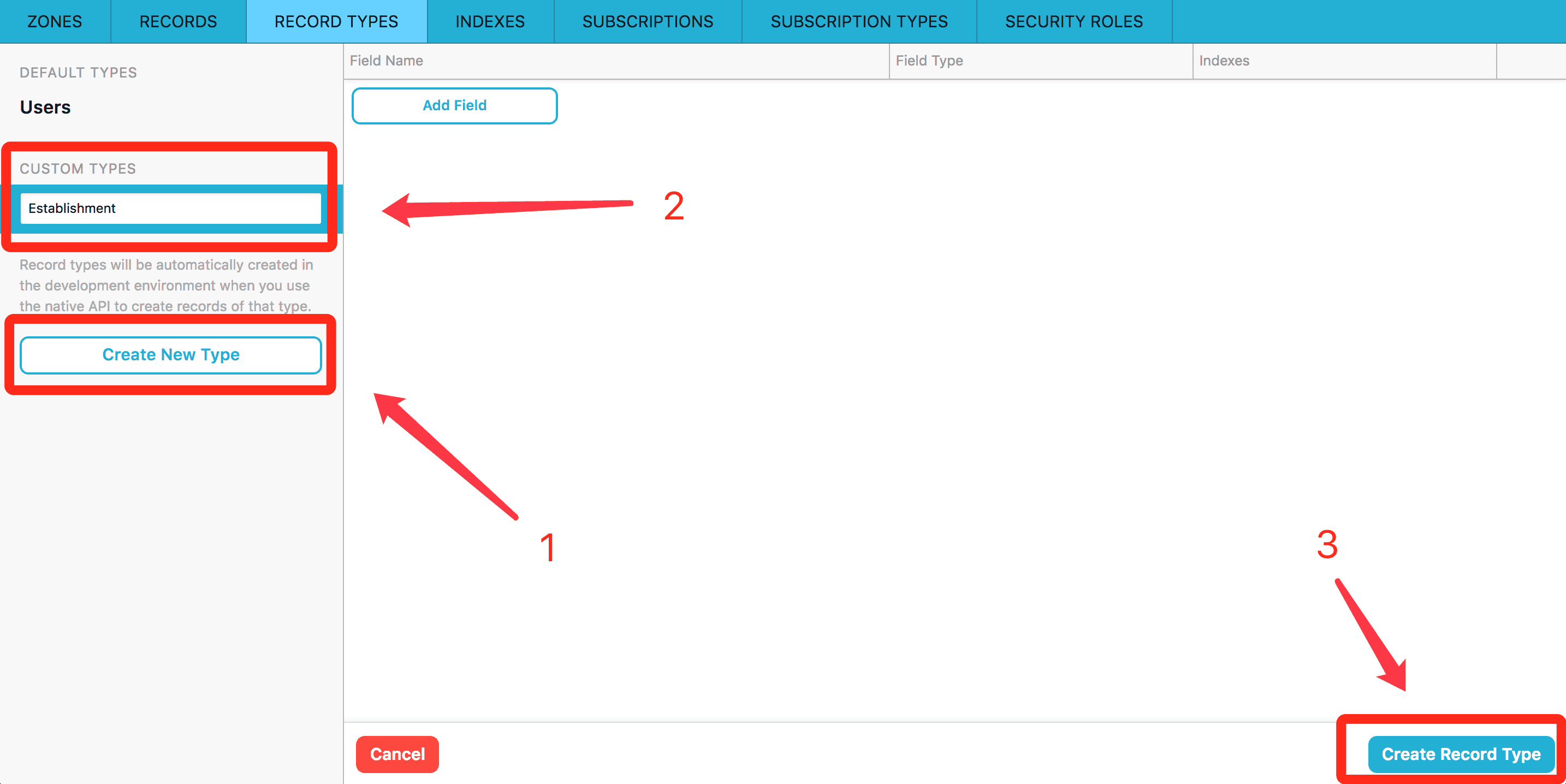 在CloudKit Dashboard里进入Development的Data分组,选择RECORD TYPE栏,如图所示,选择Create New Type创建新的记录类型: