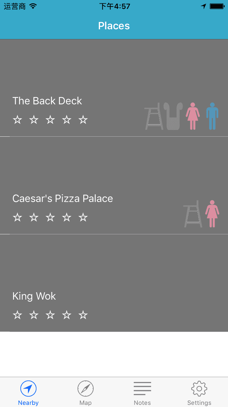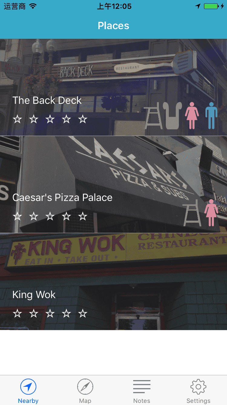 本教程的Demo,BabiFüd是一个类似于“速度餐厅”的App。用户根据小屁孩友好度,而不是根据食品质量,服务速度或价格来评价的餐厅。 这里面包括设施新旧,小屁孩餐具和食品的健康程度来作为评价基准。该应用程序包含四个选项卡:附近餐厅列表,附近餐馆的地图,用户笔记和设置。本教程中我们只使用附近餐馆的列表这个选项卡。下面简单的展示下Demo效果。