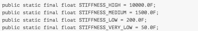 默认设置为STIFFNESS_MEDIUM,在官网同样贴了四张对应不同值得对比图,该值越大,恢复到之前状态的时间就越短。可以修改DampingRatio或 Stiffness查看效果
