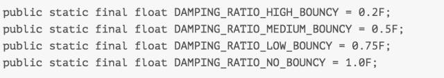 默认设置为DAMPING_RATIO_MEDIUM_BOUNCY,在官网上贴了四张很Q弹的图片,分别对应不同值的效果,该值越大,反弹次数越少,值为1时不反弹。