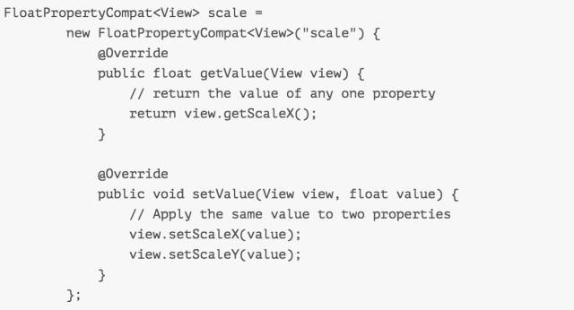 创建FloatPropertyCompat实例,在setValue()方法中更新要修改的动画属性,在getValue()方法中返回当前属性值,示例代码统一改变了SCALE_X和SCALE_Y属性,自定义属性创建好之后可以像其他动画属性一样使用它,