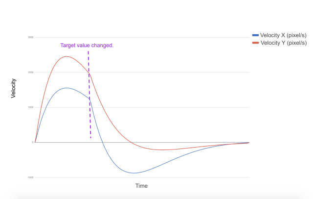 对比了两组动画的差别,图1动画无法追踪速度,在进行下一帧的时候它的速度几乎还是从0开始的,速度值突然的变化给用户不连贯的视觉体验。图2动画可以追踪速度,在第二阶段力的方向改变,导致原先的速度发生变化,图片看起来很自然地移动到新的位置