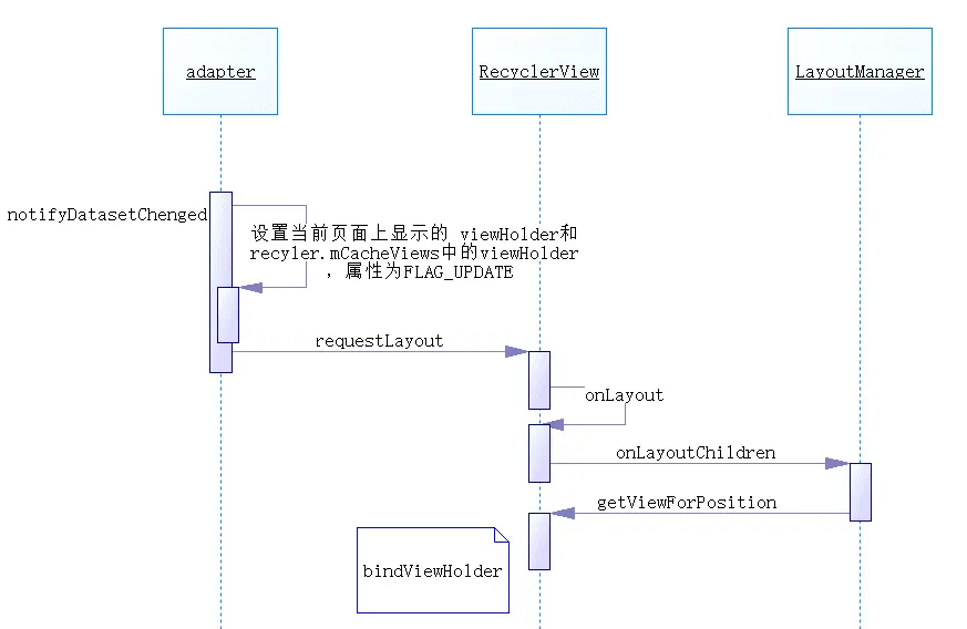 notifyDataSetChanged先会将当前页面上所显示的VIewHolder以及 Recycler.mCacheViews 内的viewHolder 属性添加ViewHolder.FLAG_ADAPTER_POSITION_UNKNOWN、ViewHolder.FLAG_UPDATE | ViewHolder.FLAG_INVALID 然后再去调用 requestLayout() -> layoutManager.onLayoutChildren()