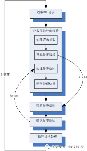 虽然异步代码有性能上的优势,但是代码的可读性却往往比同步代码要差,因为一个完整的业务流程,可能被切分到多个不同的异步回调代码中,在阅读代码的时候难以有一个完整的流程印象。所以Pebble引入了协程的能力:用户的每个RPC处理,都会自动建立一个协程。也就是说,用户可以在编写RPC的“骨架代码”内容时,随时使用Yiled()语句切换出去,然后在异步处理完成后用Resume()切换回来。这样,一个需要经过多次异步处理的业务逻辑,就可以在同一段函数中完整记录。除了可以在RPC中使用协程外,定时器的回调函数也会建立一个单独的协程供业务代码使用。