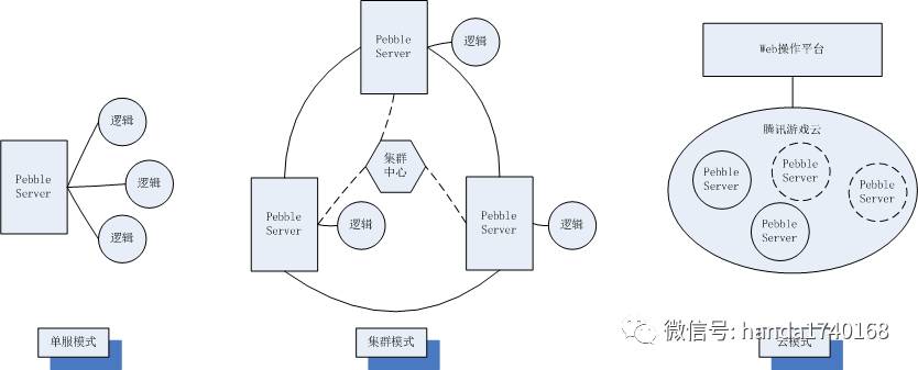 由于Pebble是被设计用于构建大规模游戏服务器集群的,因此其自带了丰富的集群特性。同时,考虑到游戏常常在开发和测试过程中,需要快速搭建一些小型的服务器,所以Pebble也着力简化服务器的独立部署。所以Pebble设计了三种模型的集群特征:单服(standalone)、集群(cluster)、云(cloud)