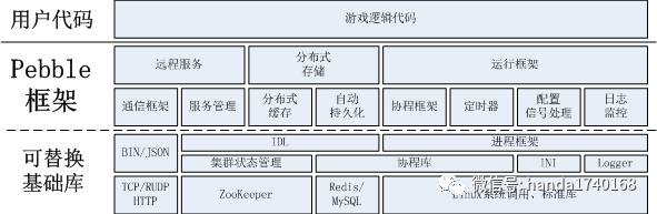 Pebble框架腾讯互动娱乐事业群(IEG)研发部,在多年支持腾讯游戏经验积累下,开发的一款通用型游戏服务器端开发框架。此框架的使用非常容易学习,可以在几乎无依赖的环境下,满足所有常见的游戏服务器端基础功能;同时也具备无须修改业务逻辑代码,就可以建立起海量承载的分布式集群;最后,这个框架还能配合腾讯云的分布式计算平台,提供自动化运维、丰富运维监控和日志统计、资源智能弹性伸缩的能力。