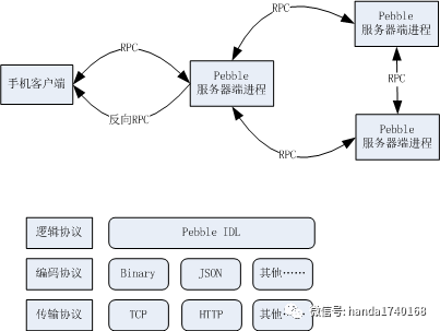 Pebble支持“客户端-服务器”以及“服务器-服务器”通信。用户可以使用Pebble提供的库很简单的实现手机客户端对Linux服务器进程的通信;同时Linux服务器进程之间,也可以用Pebble库简单实现通信功能。Pebble本身可以同时支持多种传输协议和编码协议,包括TCP和HTTP用于传输,Binary和JSON用于编码,用户也可以自定义扩展支持的协议。