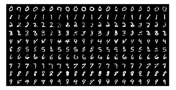 基于这样的算法,作者做了两个任务:一个是MNIST的字体生成任务,另一个是图像多标签任务。这里就谈MNIST字体生成任务,要求输入数字,输入对应字体。那么这里的数字是处理成one hot的形式,也就是如果是5,那么对应one hot就是[0,0,0,0,0,1,0,0,0,0]。然后和100维的z向量串联输入。