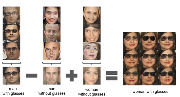 然后就是比较有意思的了,看G可以通过改变z向量,生成怎样不同的图片。不同的z向量可以生成不同的图像,那么,z向量可以线性加减,然后就可以输出新的图像,前面的图就是这种演示。非常神奇,说明z向量确实对应了一些特别的特征,比如眼镜,性别等等。这也说明了G网络通过无监督学习自动学到了很多特征表达。