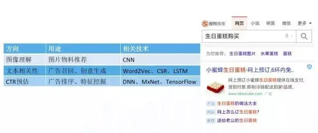 深度学习的应用很广泛,具体到广告领域:如图像理解,像刚才介绍的图像物料推荐,这个是用 CNN 技术来做;还有文本相关性,通常可以来做广告召回,以及创意生成等事情,相关技术比如 LSTM,以及刚才提到的 CSR;还有CTR预估,深度学习可用来做广告排序和相关的特征挖掘,相关技术如CNN、MxNet和TensorFlow等。图 4 举的例子是一个典型应用,具体到这个广告而言,蛋糕的小图片是通过刚才的技术做上去的,有很多客户是属于中小客户,自己不具备强大的运营能力,他可能想为广告配一些图,但没有精力做这件事情,我们就会帮他自动匹配一些图片,这会影响后续的很多东西,包括订单转化等事情。广告下方的三行子标题也是自动生成,系统会判断一下当前有哪些东西用户比较感兴趣,而且和客户有关,就会放在这里,这部分涉及到文本相关性计算。这是主要介绍的三点深度学习在广告中的应用。