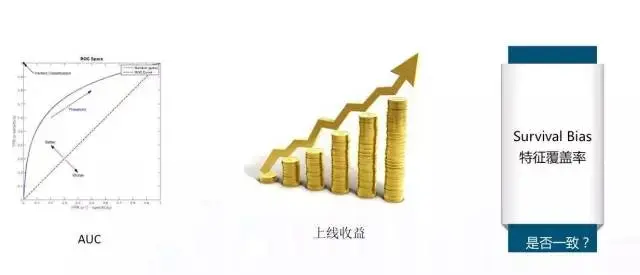 二、最直接的评估方法,上线收益。如果线下发现 AUC 是有提升的,要到线上去看最终收益有没有涨,看到底多赚多少钱?这两个指标有一定的关联性,AUC 比较高的话收益一定会涨,也有一些例外的情况。为什么线下效果很好,到了线上之后没有变化?通常从两个角度来看:特征的覆盖率,你这个特征如果非常好,但覆盖的东西很有限,线上 100 个指征只覆盖了 2 个,即使这两个获得很大的提升,最终的收益也比较有限;Survival Bias,线下训练时用到的数据都是自动筛选过的结果,一般凡是能展现的广告通常都是之前系统认为比较好的广告,在这个数据集上表现比较好,不代表你在真正放到线上之后表现好。因为真正上线之后你会对所有的广告进行扫描计算,这时把坏广告干掉的能力就会显得比较关键。这两点可能会导致线上和线下不一致,其实做别的事情也会有同样的问题,一个是理论一个是实际,这两个如果不一致时,应该想一想到底哪一块出了问题?