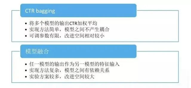 CTR bagging 将多个模型的输出 CTR 加权平均,实现方法简单,模型之间不会产生耦合,但是可调参数有限,改进空间相对较小。