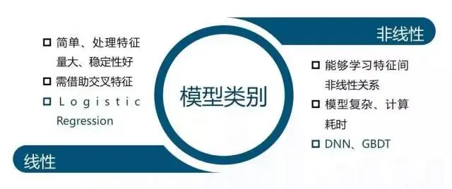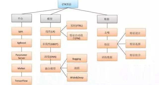 在模型方面:首先有线性模型,LR 模型又有一些细分算法,实时(FTRL)和特征自动组合(FM);非线性的模型是有GBDT,是决策树的变体,可以看作多个决策树的组合;然后是深度学习模型, 如DNN;