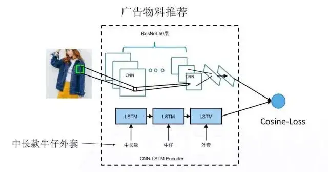 如图 3 是广告物料推荐,假设有一张图片想知道含义,想知道跟这个图片相关的文本有哪些。图片采用 CNN 来处理,文本采用 LSTM 进行处理,最后把两者通过cosine的方式结合在一起训练以达到最终目的。