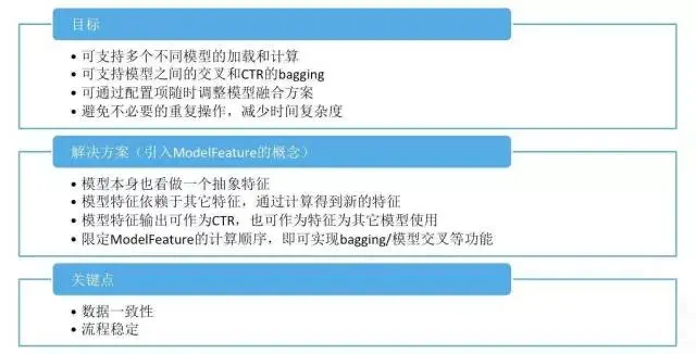 由于第一种方式 (CTR bagging) 的空间有限,我们就选择第二种。并针对性的做了一些设计,这些跟工程设计的关系大一些。如何做这件事情?要定一个目标,要做成什么样子来达成这个目的?首先希望这个东西能支持多个模型的加载的和计算;第二点,可支持模型之间的交叉和 CTR 的 Bagging;第三点,可通过配置项随时调整模型融合方案;第四点,避免不必要的重复操作,以降低时间复杂度。根据这 4 个要求我们做了个解决方案,核心理念是引入了ModelFeature 的概念,即把模型本身看做一个特征,模型通过计算得到新的特征,对于模型输出可作为 CTR,也可以作为特征为其它模型使用。限定 ModelFeature 的计算顺序,即可实现 Bagging 和模型交叉等功能。
