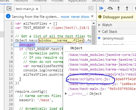 继续报错 - 404,找不到/base/src.js - 在test-main.js里观察window.__karma__.files,如图所示,我们可以看到引入的src.js实际路径为/base/srcipts/src.js