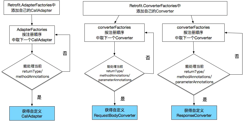在Retrofit初始化的时候, 允许添加CallAdapterFactory和ConverterFactory.