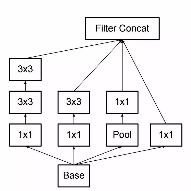 过滤器通过卷积压缩精简也能被分解进入更为复杂的模块,如图所示: