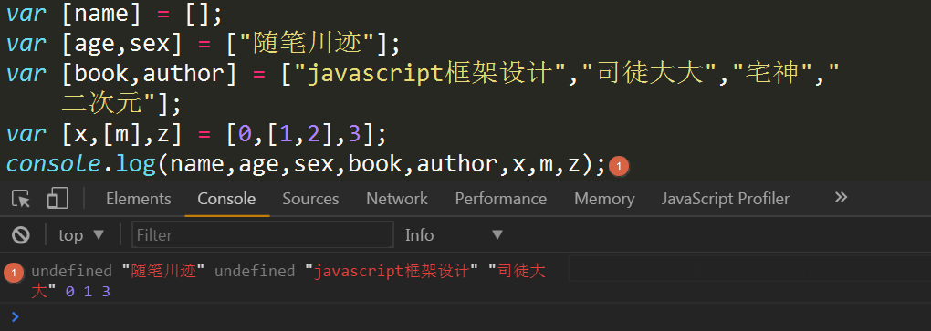 解析不成功,变量的值就等于undefined(等式左边变量与等式右边变量值不对等的话,不对等的变量会变为undefined,相当于只声明变量,并没有赋值),若右边值多于左边变量数,多于的会被舍弃掉,但是有一种情况是不完全解构,即等号左边的模式只匹配等号右边变量值的一部分,这种情况解构依然是可以成功的,这种情况为不完全解构