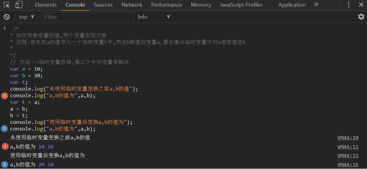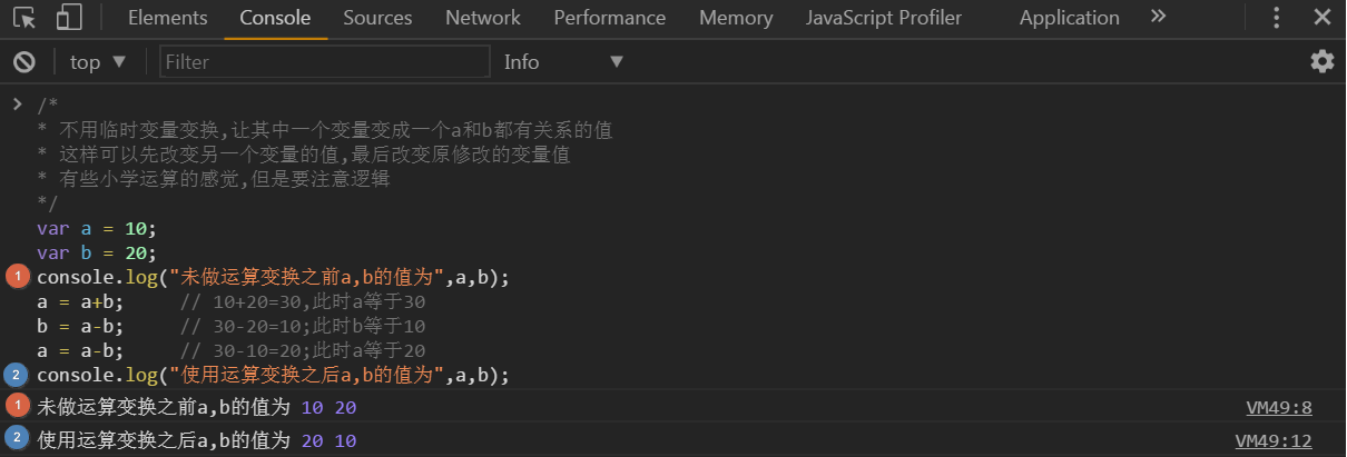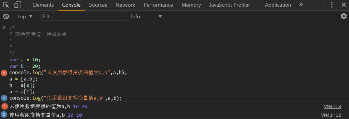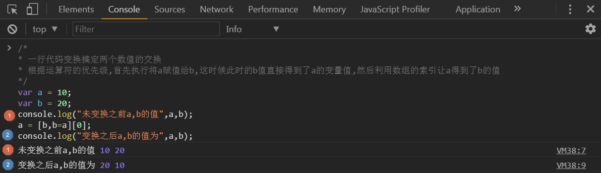 不使用临时变量方式,让其中一个变量变成一个a和b都有关系的值 - 方法三:变换变量值的方式,把变量对象变成了一个对象,这个对象保存着交换的键值对,最后赋值就可以了的